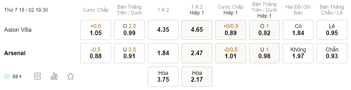Tỉ lệ kèo Aston Villa vs Arsenal
