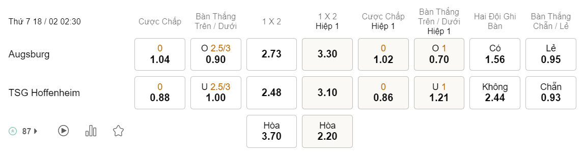 Tỉ lệ kèo Augsburg vs Hoffenheim