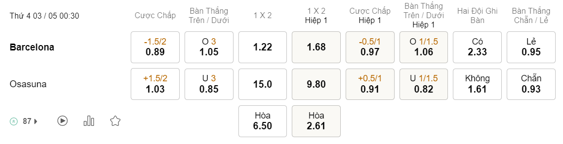 Như đã phân tích, với sự hưng phấn đang có được, các cầu thủ Barca sẽ chủ động dồn lên tấn công ngay từ những phút đầu. Theo thống kê, cả 7 trận gần nhất Barcelona đối đầu với Osasuna, NHM 2 đội đều đã được chứng kiến bàn thắng mở tỉ số tới ngay trong hiệp 1. Do đó, khả năng cao điều tương tự sẽ được lặp lại ở trận đấu này dành cho đội chủ nhà vốn được đánh giá cao hơn.