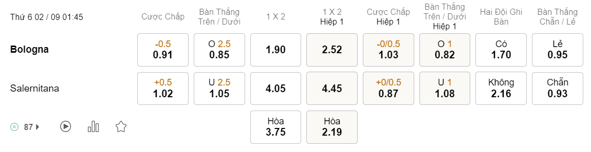 Soi kèo châu Á Bologna vs Salernitana: 0.91*0.5*1.02