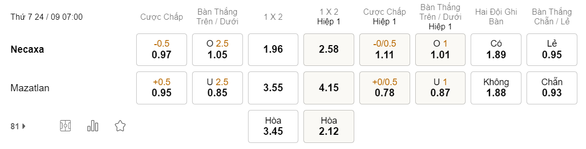 Tỉ lệ kèo Club Necaxa vs Mazatlan
