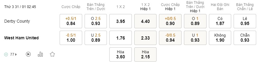 Soi kèo hiệp 1 Derby County vs West Ham: 0.90*0/0.5*0.94