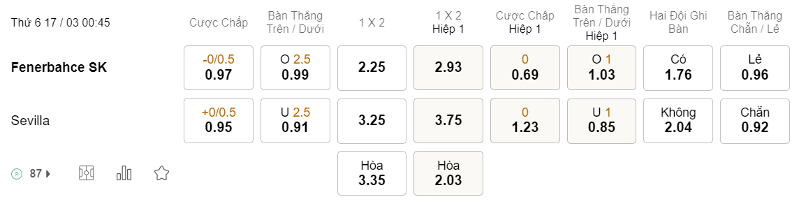 Tỉ lệ kèo Fenerbahce vs Sevilla
