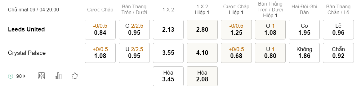 Soi kèo hiệp 1 Leeds vs Crystal Palace: 1.25*0/0.5*0.68