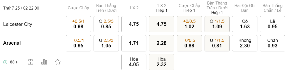 Soi kèo hiệp 1 Leicester vs Arsenal: 1.02*0/0.5*0.88