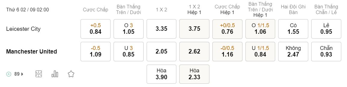 Tỉ lệ kèo Leicester vs MU