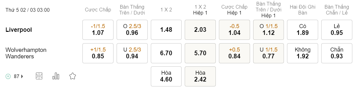 Soi kèo châu Á Liverpool vs Wolves: 1.07*1/1.5*0.85