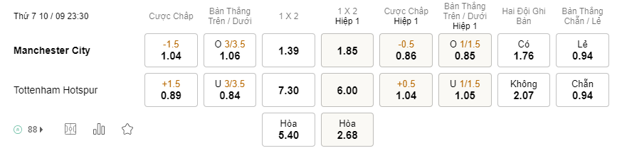 Soi kèo châu Á Man City vs Tottenham: 1.04*1.5*0.89