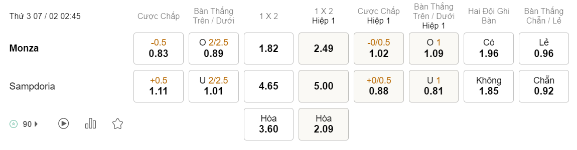 Tỉ lệ kèo Monza vs Sampdoria