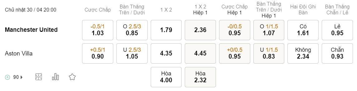Tỉ lệ kèo MU vs Aston Villa