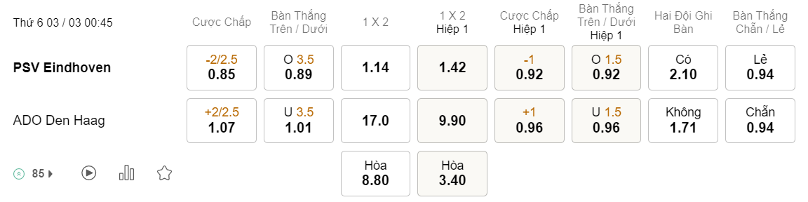 Tỉ lệ kèo PSV vs Den Haag