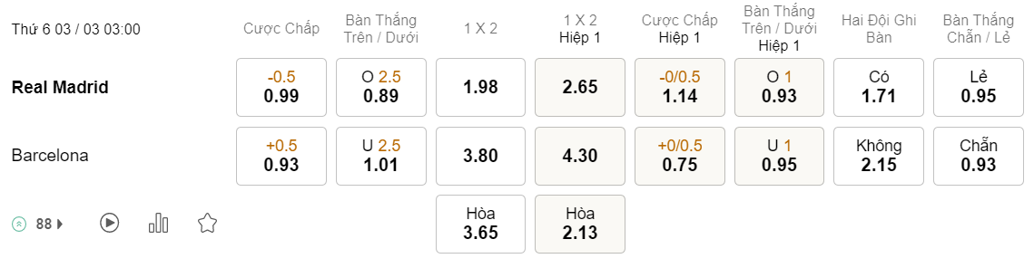 Tỉ lệ kèo Real Madrid vs Barcelona