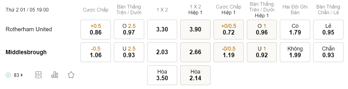 Tỉ lệ kèo Rotherham vs Middlesbrough