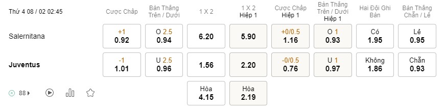 Như đã đề cập, đây là một cặp kín kẽ và thường chứng kiến không nhiều bàn thắng được ghi. Tuy vậy, chúng lại thường tới khá sớm khi cả 3 lần gần nhất Juventus đối đầu Salernitana, bàn thắng đã xuất hiện ngay trong hiệp 1. Vì vậy khả năng cao, 45 phút đầu tiên của trận đấu này sẽ có bàn thắng dành cho đội bóng được đánh giá cao hơn là đội khách.