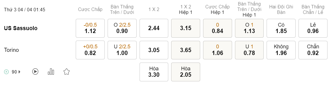 Bên phía đối diện, Torino có thành tích sân khách đặc biệt tệ với việc chỉ có đúng 1 thắng lợi trong 5 lần gần nhất xa nhà. Còn lại, đội bóng này thua tới 3 và hòa 1. Vì vậy, Sassuolo đang được đặt cửa thắng khá lớn.