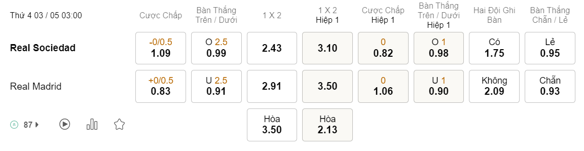 Soi kèo hiệp 1 Sociedad vs Real Madrid: 0.82*0*1.06