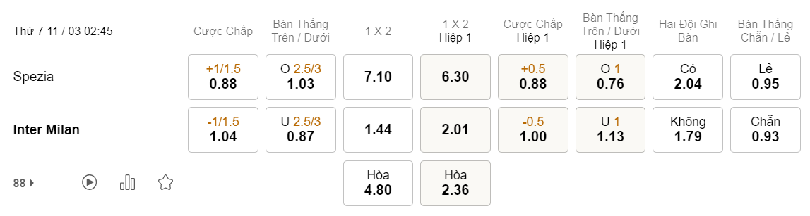 Soi kèo hiệp 1 Spezia vs Inter: 0.88*0.5*1.00