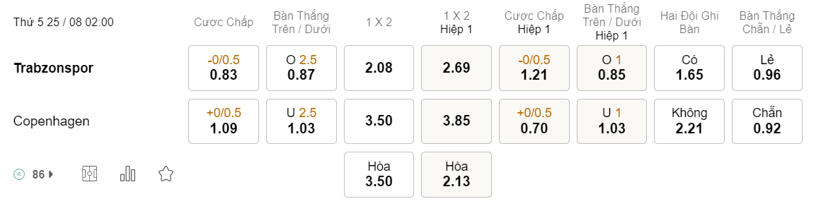 Soi kèo tài xỉu Trabzonspor vs Copenhagen: 0.87*2.5*1.03