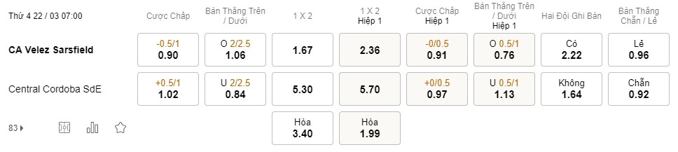 3 trận đấu gần nhất Velez đối đầu Central Cordoba đều đã chứng kiến ít nhất 3 bàn thắng được ghi mỗi 90 phút. Vì vậy, một số trang truc tiep bong da hd nhận định tỉ lệ nổ Tài sẽ là lớn hơn ở cuộc đọ sức này.